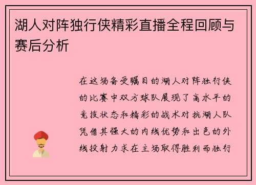 湖人对阵独行侠精彩直播全程回顾与赛后分析